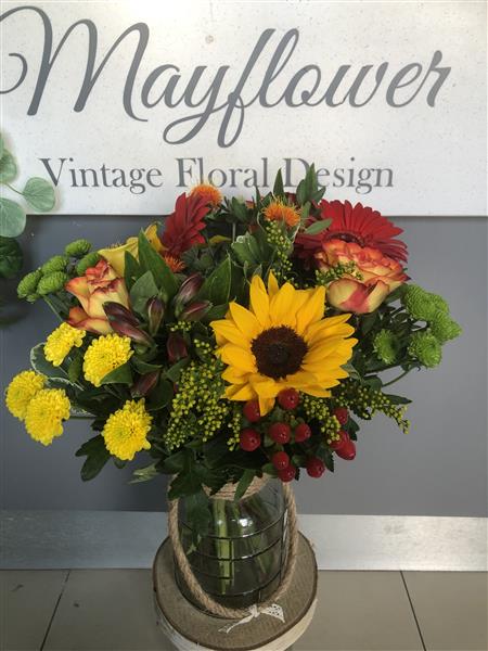 seasonal flowers and foliage arranged in a beautiful glass jar