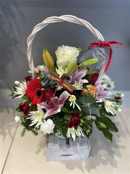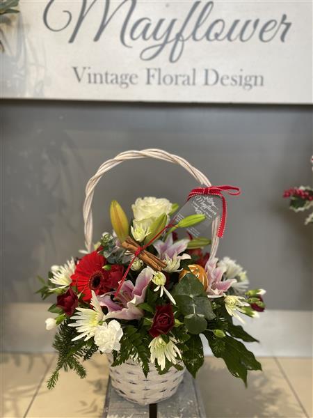 Choose from a range of colour options and we will create a traditional basket arrangement using seasonal blooms and foliage.