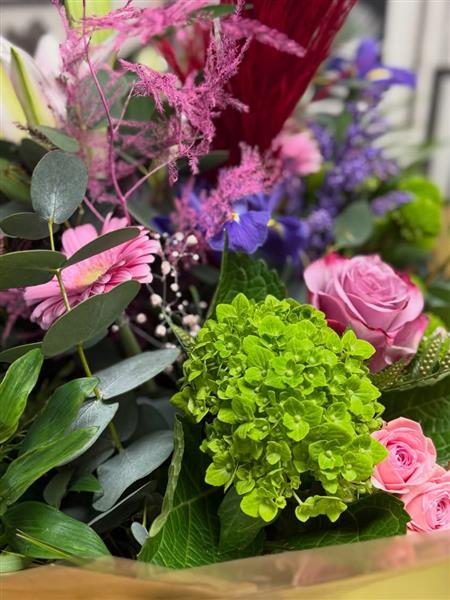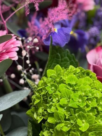 A vivid mix of green hydrangea, pink roses, lilies, iris, eucalyptus, and textured dyed grasses, creating contrast through bold colour, height, and layered natural elements.