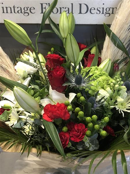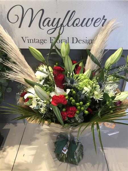 A stunning elegant bouquet of white scented lilies, roses and other seasonal flowers this show stopper will certainly impress