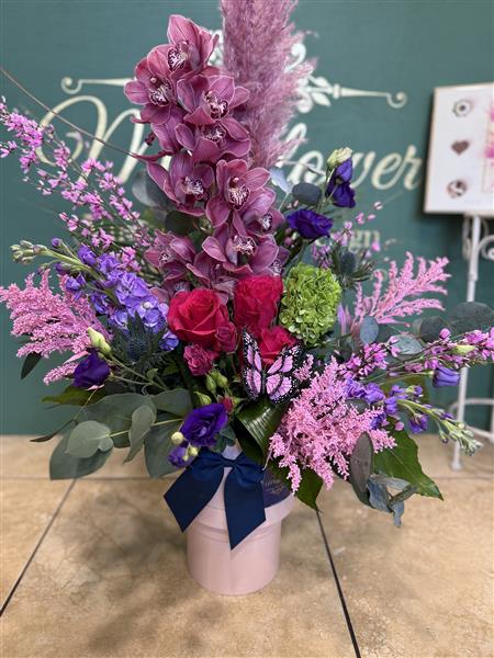 A layered arrangement of orchids, anthurium, roses, carnations, hydrangea, and delicate filler blooms with soft greenery, finished with textured elements and a decorative butterfly detail.