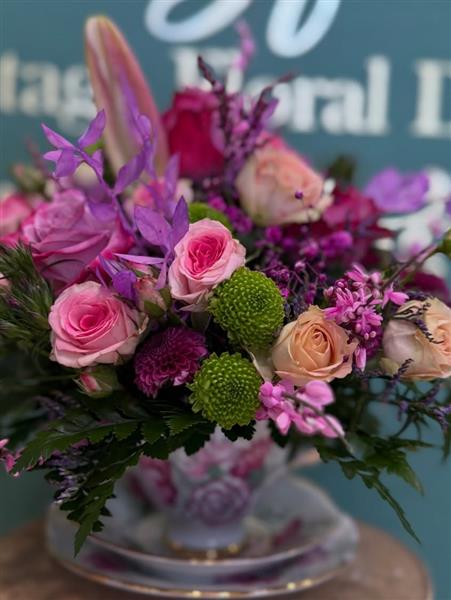 A delicate mix of pink and peach roses, chrysanthemums, seasonal blooms, and soft greenery arranged in a teacup style with gentle colour layering.