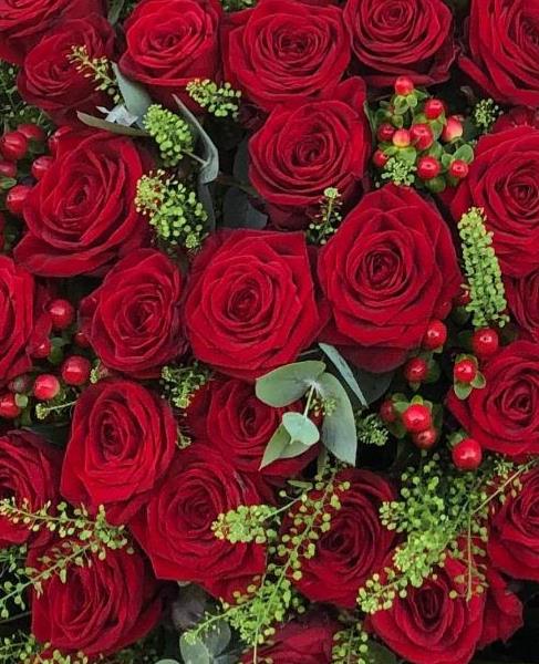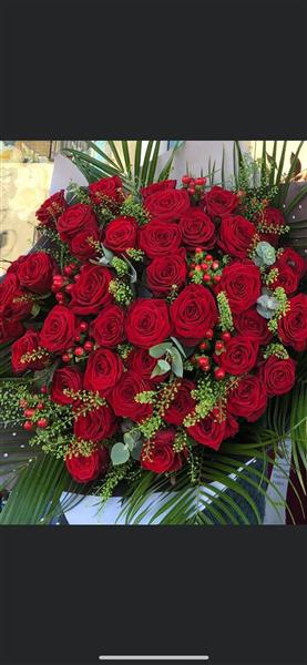 50 Large headed roses and seasonal berries and foliages.2 days notice unless for valentines